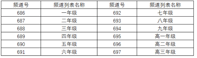 上海市各年级课程内容均由指定电视频道首播,分别对应小学至高中12个年级的课程内容,频道号如下: