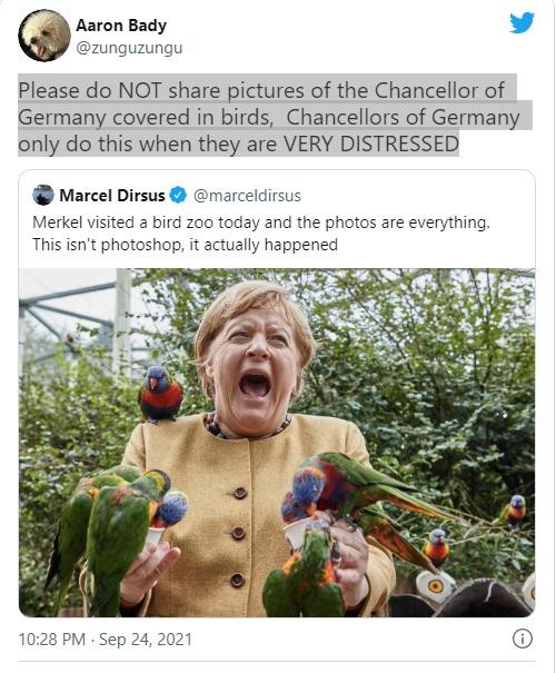 请不要分享德国总理被鸟覆盖的照片,德国总理只有在非常痛苦的时候才会这么做