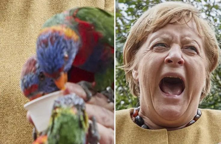 摄影师抓拍,欧洲“铁娘子”默克尔喂鹦鹉和鹦鹉合照被啄,太逗了