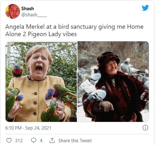 默克尔(Angela Merkel)在一个鸟类保护区,让我有种《小鬼当家2》鸽女的感觉