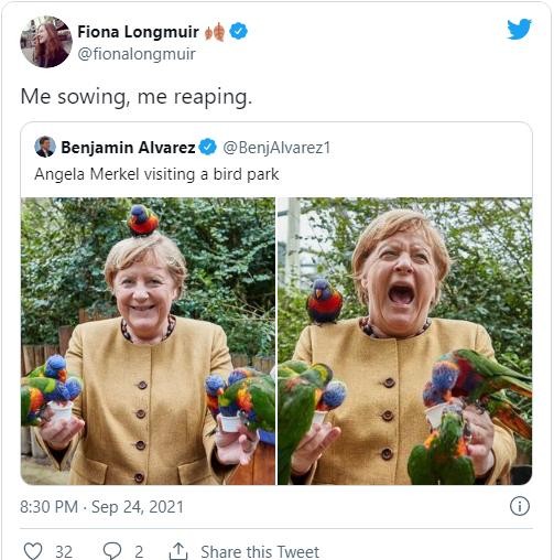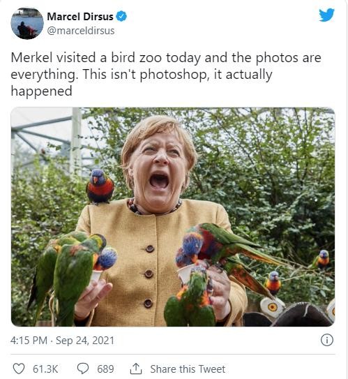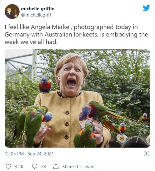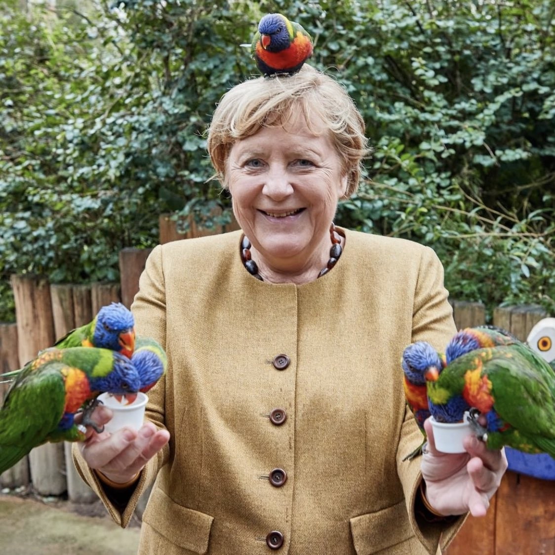 我觉得默克尔(Angela Merkel),今天在德国与澳大利亚鹦鹉的合影,体现了我们都经历过的这一周。
