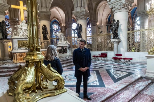 11月29日,法国总统马克龙(右)在巴黎圣母院内了解修复情况。 新华社/法新