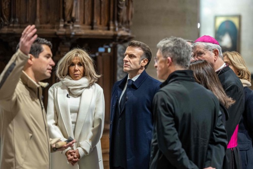 11月29日,法国总统马克龙(下右二)在巴黎圣母院内了解修复情况。 新华社/美联