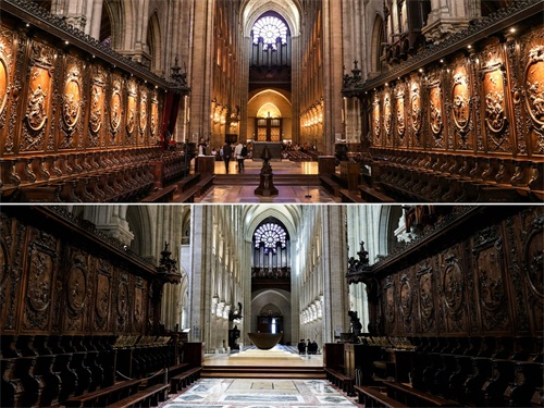 这张拼版照片显示的是法国巴黎圣母院发生火灾前(左,2017年6月28日摄)和修复后(右,2024年11月29日摄)的内部景象。 新华社/法新