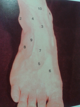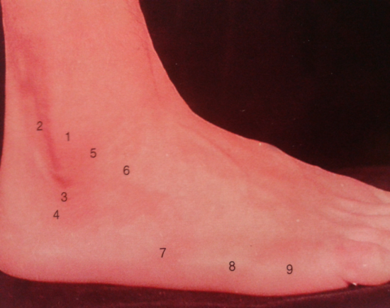 腓肠神经:腓肠内侧皮神经接受腓神经交通支,沿外踝后缘,延续为足背外侧皮神经,分布足跟外侧