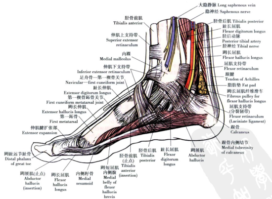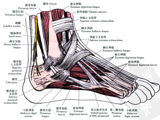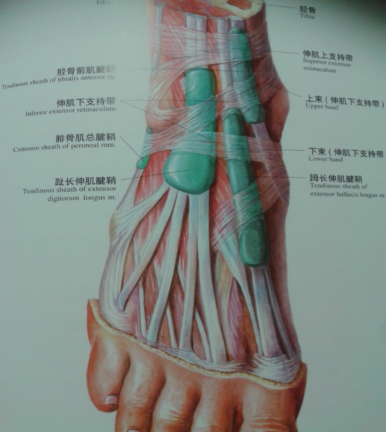 伸肌上支持带:呈带状位于踝关节前上方,连于胫腓骨下端之间,由内至外通过胫骨前肌、廻长伸肌、趾长伸肌与腓骨第三肌。