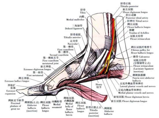 踝管:屈肌支持带和跟骨内侧面及内踝围成。