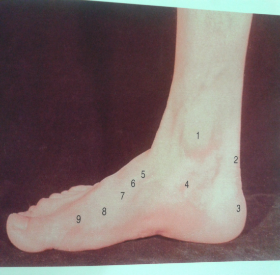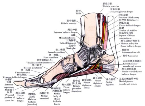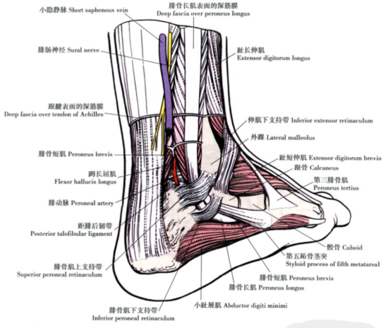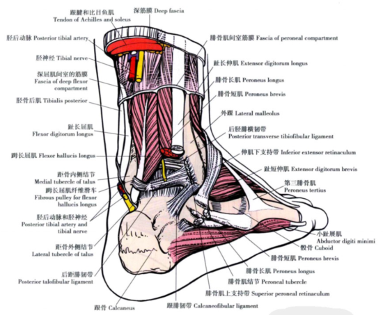 腓骨长肌 :经外踝后方,腓骨短肌后方,止于足底筋膜。