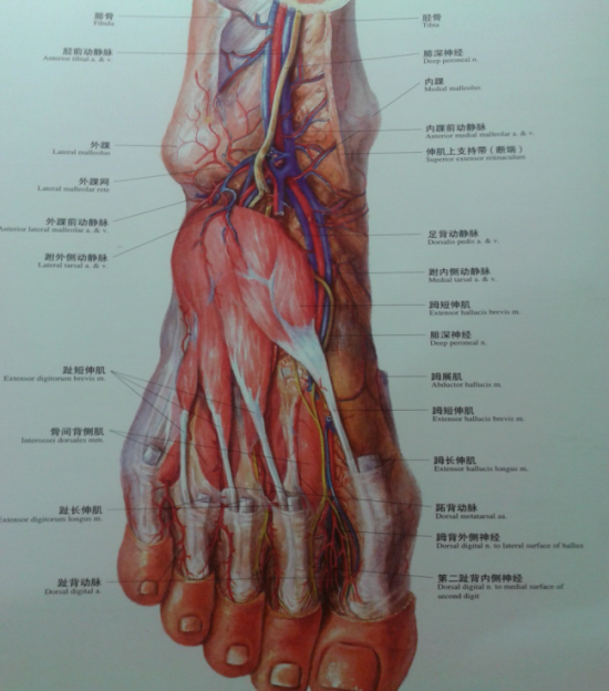 足背动脉:于伸肌上支持带下缘延续于胫前动脉,越过距骨舟骨及中间楔骨,于第一跖骨间隙近侧穿入足底。