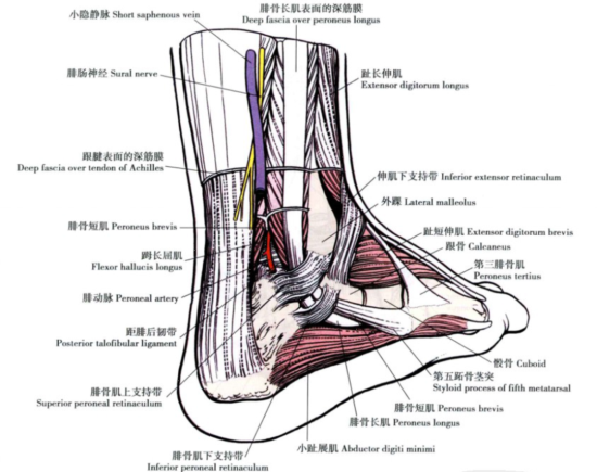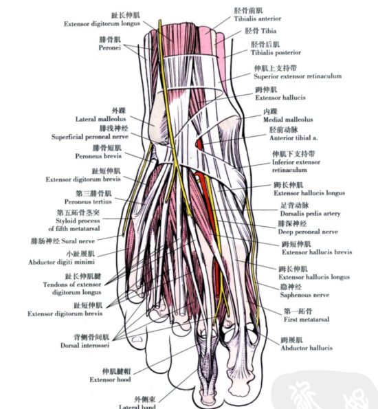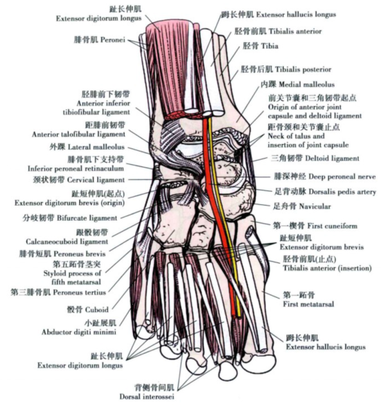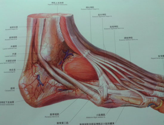 外踝前动脉:由胫前动脉发出,经趾长伸肌肌腱与骨面至外踝。