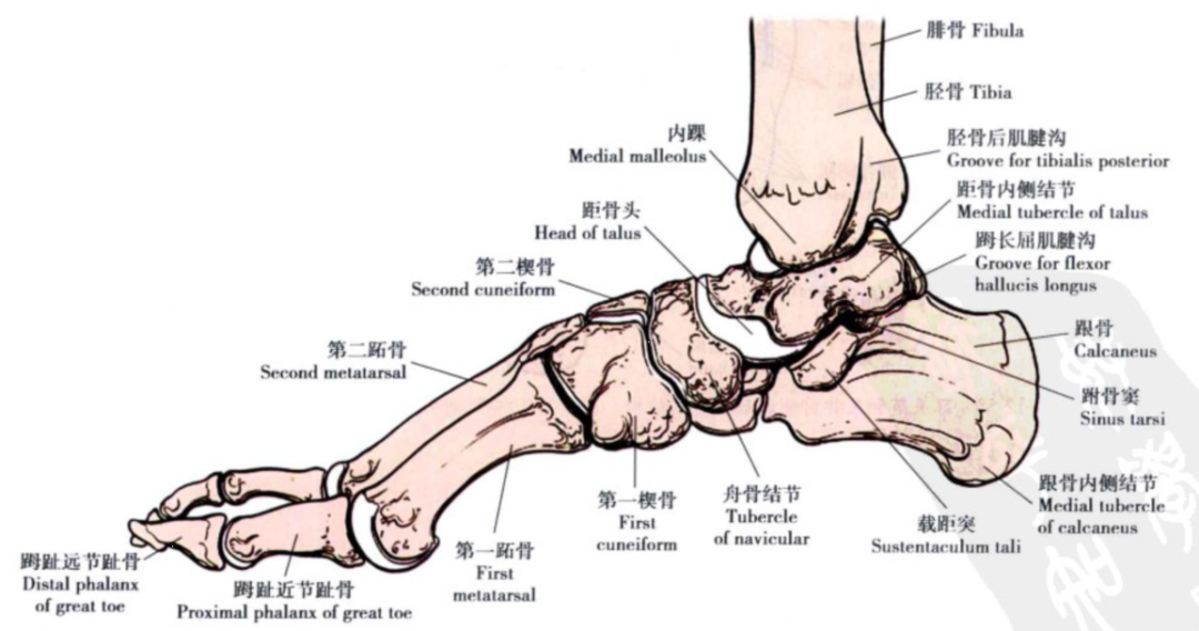 距骨:分为头、颈、体三部分,与足舟骨、跟骨、胫骨和腓骨形成关节。