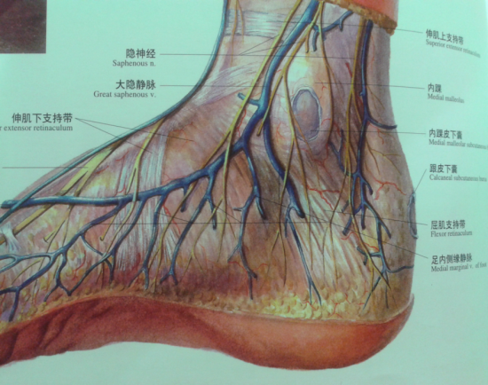 大隐静脉:由足内侧缘静脉汇集,沿内踝前方上行