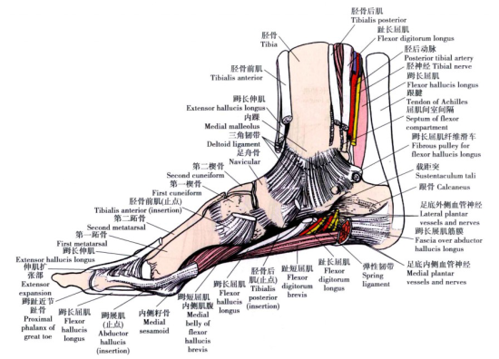 ①内踝:顶端分成两个钝性突起(前丘前结节、后丘后结节),有三角韧带附着,其后侧有一沟,胫后肌腱由此经过