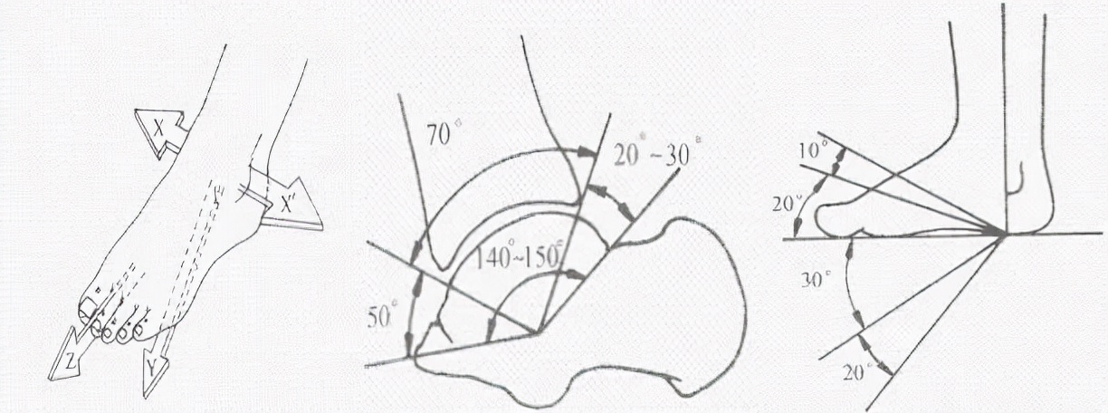 踝关节与足部的一系列关节加上膝关节的旋转轴构成了一个有三个自由度的关节,使足部在任何位置可适应不同的不平整的路面行走。