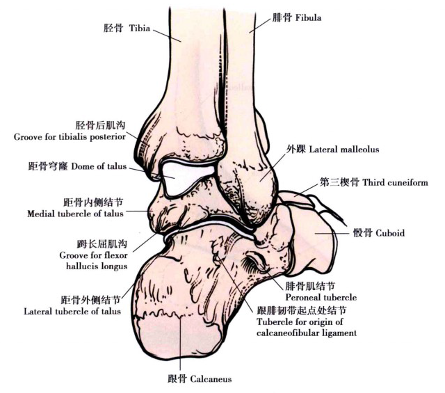 ②外踝:位于胫骨前后结节构成的切迹中,胫腓骨之间没有关节面,但两者之间有一定的活动度。