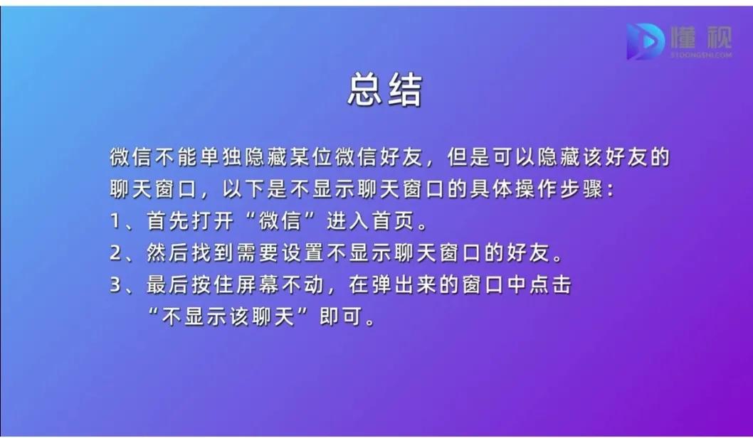 微信不能单独隐藏某位微信好友,但是可以隐藏该好友的聊天窗口,不显示聊天窗口的具体操作步骤为:1、打开“微信”进入首页。2、找到需要设置不显示聊天窗口的好友。3、按住屏幕不动,在弹出来的窗口中点击“不显示该聊天”即可。