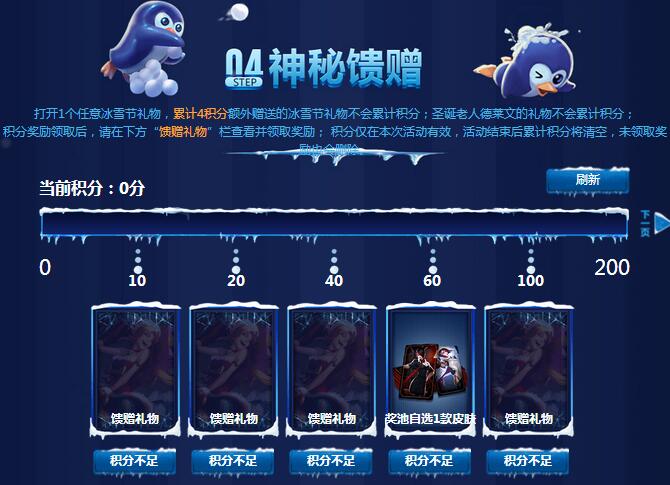 在活动期间内你可以通过开启冰雪节魔法引擎来获得奖励。在本次的冰雪节魔法引擎中你一定会获得一个史诗级以上的皮肤碎片,两个的随机皮肤碎片,额外的橙色精粹,同时你还有机会获得额外的皮肤碎片以及海克斯科技宝石。