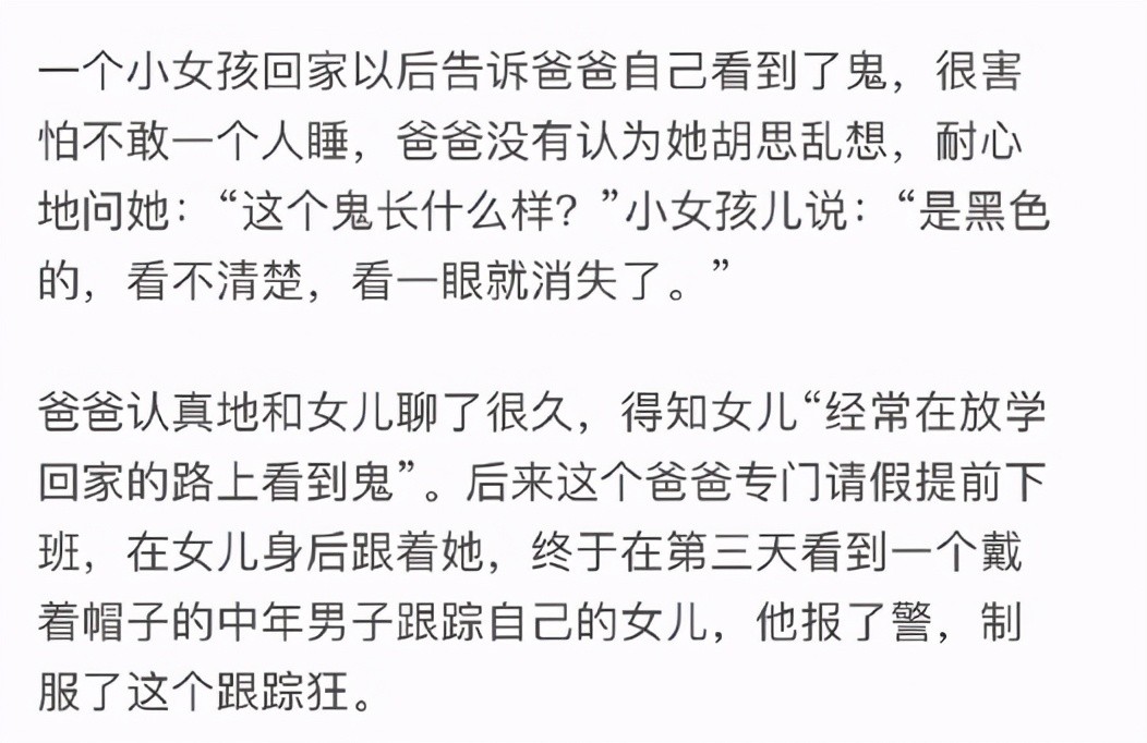 鬼对于大人来说是不存在的,并且大多数家长会因为害怕吓到孩子就去终止这个话题,直接安慰或者告诉孩子这个世界没有鬼神之说。这个爸爸的耐心引导值得我们去学习,不否定自己孩子的叙述,而是选择相信。也正是因为相信了孩子,才避免了一场悲剧的发生。
