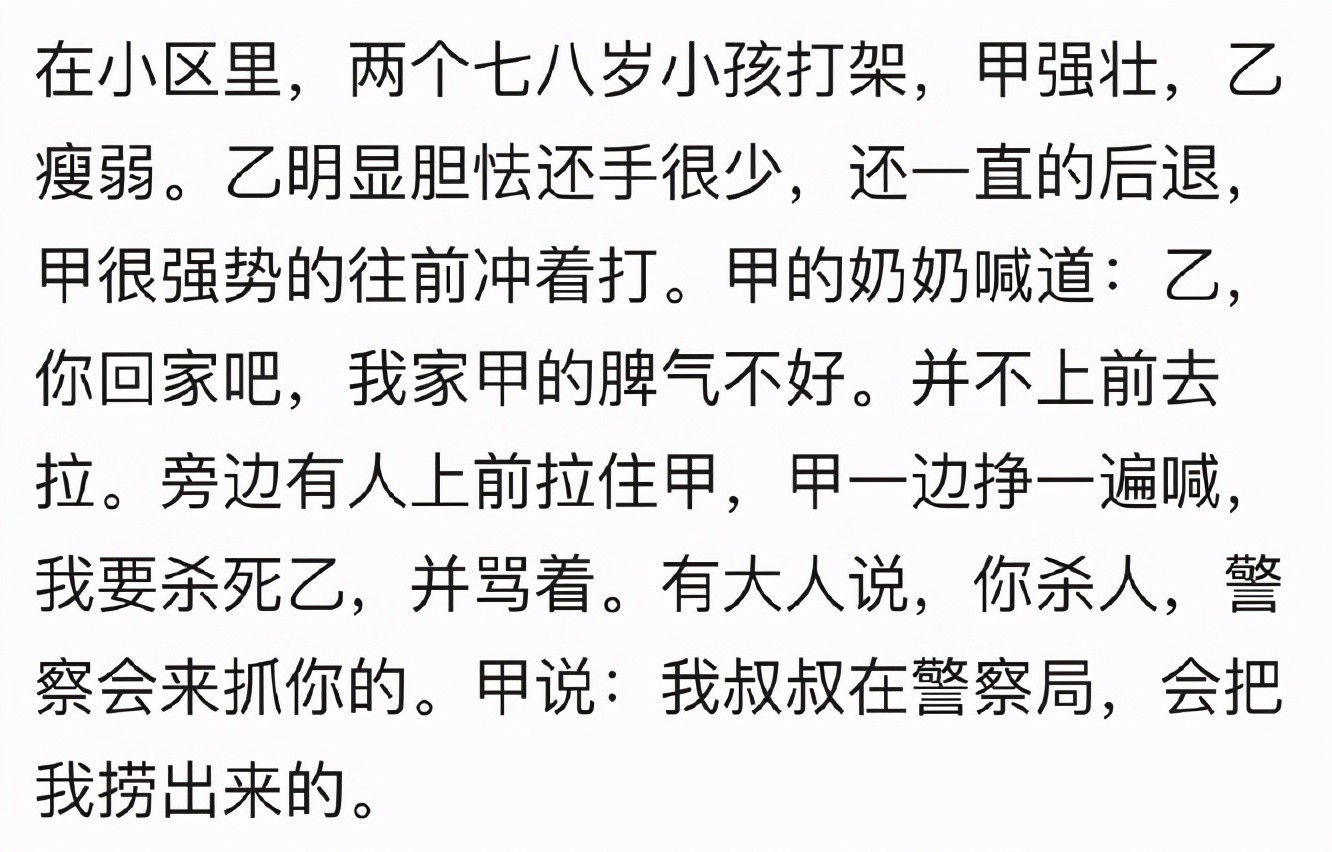 甲的奶奶不但不拉着自己的孙儿,反而让乙回家,直言自己的孙儿脾气不好,颇有霸道无礼之意。一个七八岁的孩子嘴中竟喊着杀人!也知道自己家中有亲戚在警察局,但那么自信地说叔叔会把自己捞出来,也定是与家中的教育密不可分啊......