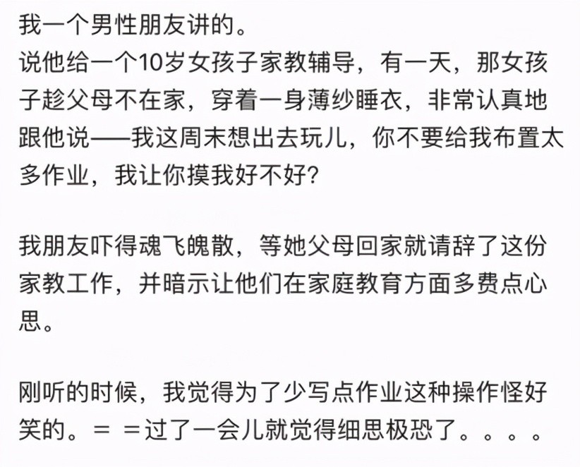 一个10岁的孩子怎么会有如此反常的做法?之前是否还有其他的家教老师?这些都不得而知,但这样一个花骨朵的年纪,如此反常的行为值得我们家长去关注。