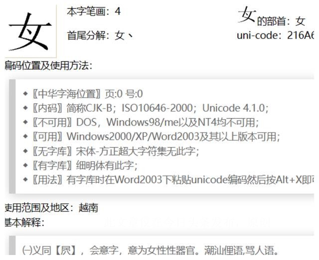 不仅如此,这个字符在广东潮州音字典中也有记录。在潮汕地区,它是女性专用词汇之一,拥有不同的读音和含义。这再次证明了这个字符在不同地区的使用和理解有所不同。