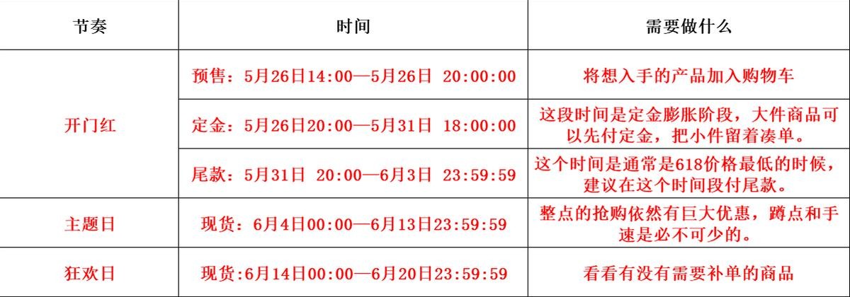 天猫618分为三个时期:开门红、主题日、狂欢日,具体时间和攻略如下: