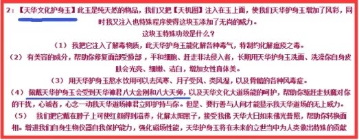 不仅如此,“天华文化”还是“中功”人员一块骗钱敛财的遮羞布。网上宣扬“天华文化”不仅仅是为了宣扬“中功”邪说,还有人借此巧立名目、兜售物品、骗取钱财。比如,有人建立所谓的“天华明珠道场”,兜售“天华文化护身玉”,谎称其具有“解毒、美容、护身、化解太阳黑子、增强磁场功能”等诸多神奇功效。