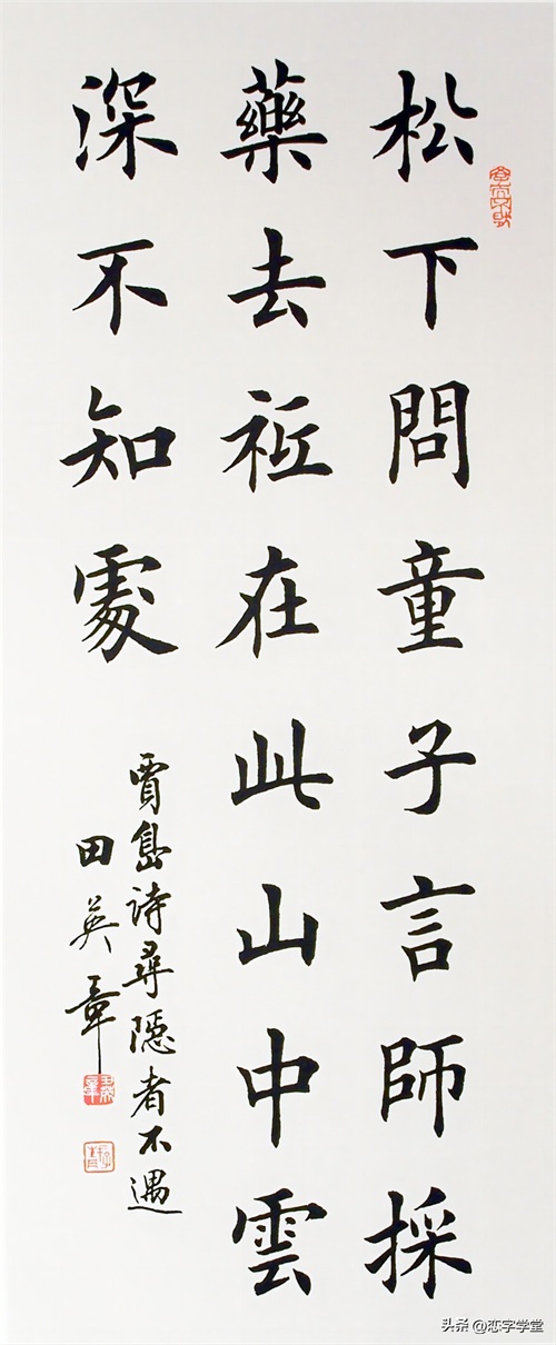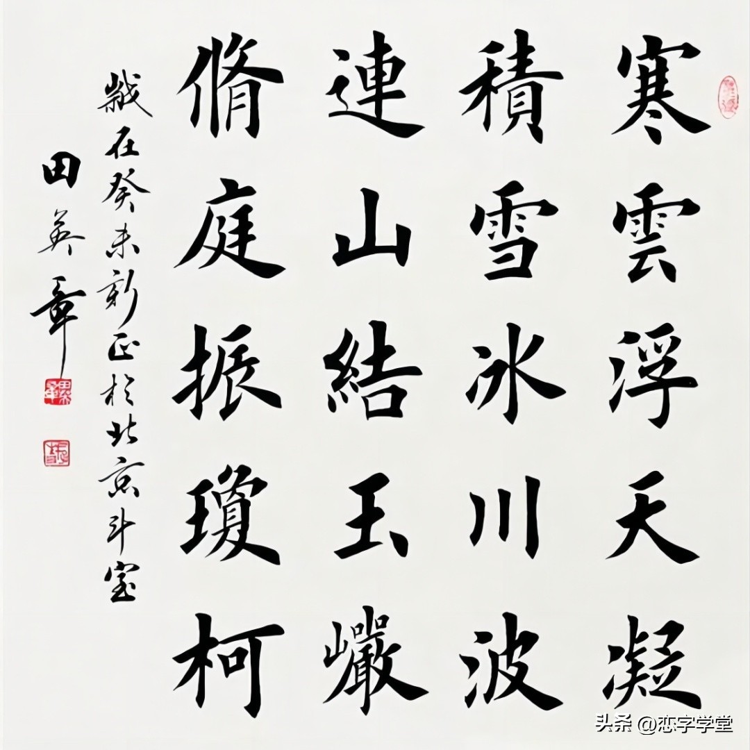 欧阳询的楷书书法更加的险绝,古拙朴素,他的笔画更为方硬,也更为坚挺。田蕴章和田英章老师的楷书相比于欧阳询的楷书而言,缺乏了欧阳询楷书中险绝劲俏的特点,而是追求一种平稳,端庄的效果。