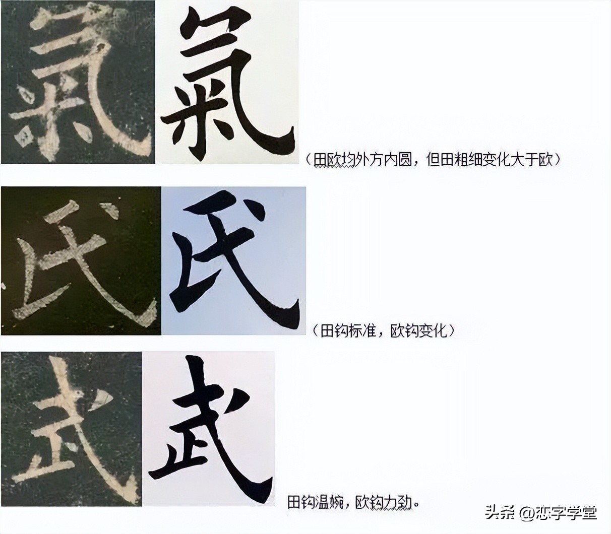 欧公的仰钩带有浓重的隶味,是欧楷的特色。但这一笔颇不好写,很多将欧楷写得死板的,往往这个钩写得不理想。田楷的仰钩也很有特色,外方内圆,灵动漂亮。但田和欧的区别还是明显的:田钩基本为标准的外方内圆,钩尖一般向正上方,而欧钩有的外方内圆,有的是内外皆圆,出钩方向常常是斜向右上方,钩的形态也和田有所不同。