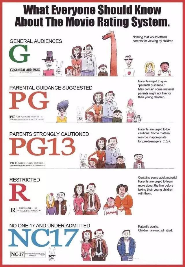 美国电影是采用分级制的,根据影片是否包含色情、恐怖、暴力、道德或政治等内容,将其分成五个级别,分别是G、PG、PG13、R、NC17。不同级别的电影,会有不同的警告。如下图所示,看不懂别着急,下面我们一一解释。