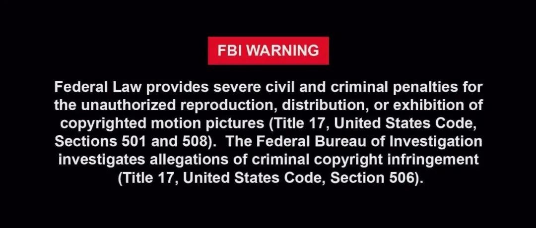 既然这些电影是挂在美国公司名下的,就必须遵守美国法律。而在美国,版权保护是由联邦调查局负责管理的。所以,我们在这些影片里看到的FBI WARNING,就是来自美国联邦调查局关于版权的警告。