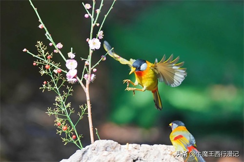 至于其它鸟,蓝翅希鹛在金殿现在太多,比较泛滥。绣眼也不少,斑胸钩嘴鹛、北红尾鸲和宝兴歌鸫也有出现。现在金殿开了很多花,花鸟图还是很容易拍到的。