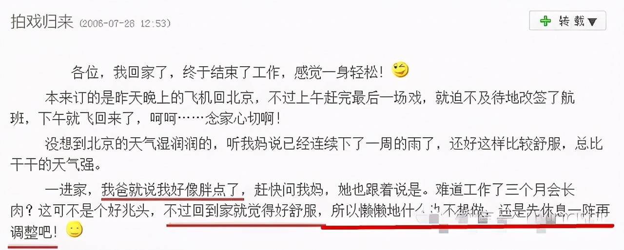 在这篇名曰《拍戏归来》的短文中,她这样写到: