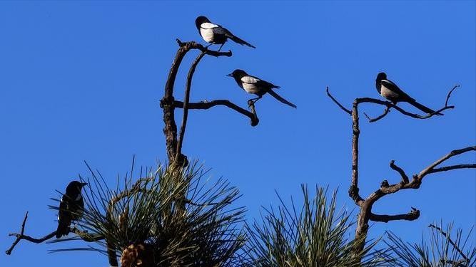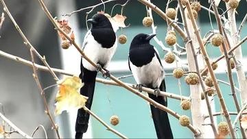 一般情况下,喜鹊是喜欢三五成群的活动的,它们白天在树梢上玩耍的同时,还会注意周边是否有食物。