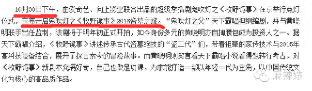 2015年10月30日,天下霸唱和向上影业合作,开启《牧野诡事》的点灯仪式。而且有一个特别有意思的事情,在29日左右,有一篇通稿出来了,就是说《鬼吹灯》的版权是属于谁的。