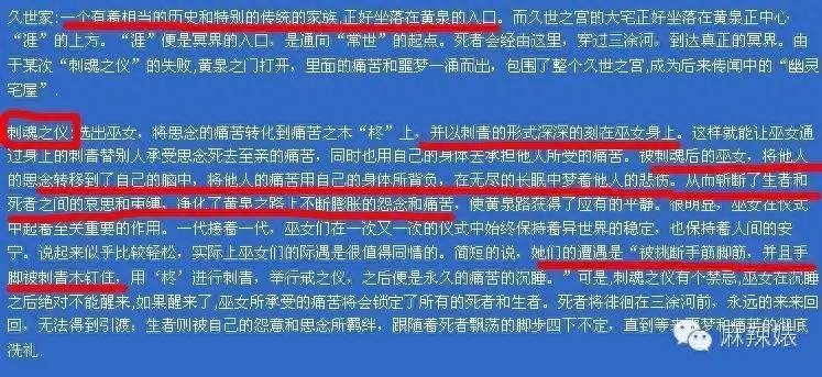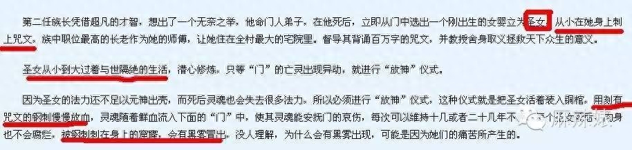 天下霸唱的原文,出处十二章,讲述荒村过去,提到了“刺青”,“镇守黄泉”,“巫女”和“圣女”。