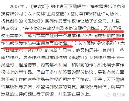 当时,天下霸唱把自己的作品卖给起点的时候,还签了一个条约,就是说自己不能再用胡八一,鬼吹灯这样的字眼来出作品。包括自己的笔名、原名都不能用。