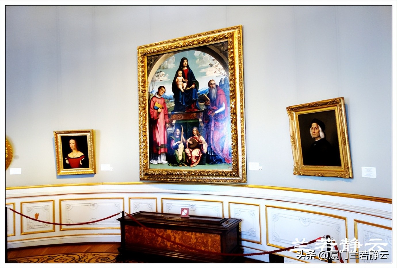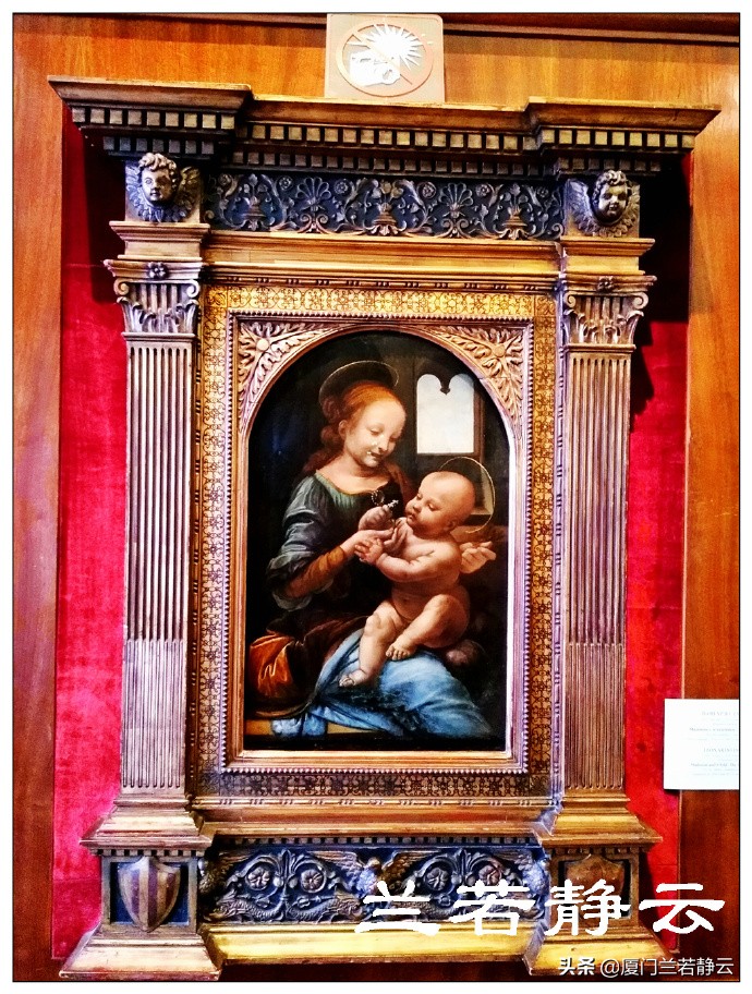 在众多油画中,达芬奇的作品尤为吸引人,堪称冬宫的镇馆之宝。这是达芬奇早期的油画《柏诺瓦的圣母》,创作于1478年,画中圣母将圣婴抱在怀里,一手扶着他,一手拿着一朵花,圣婴想要拿花,圣母与圣婴神态生动活泼,完全不像通常见到的那样庄严刻板。