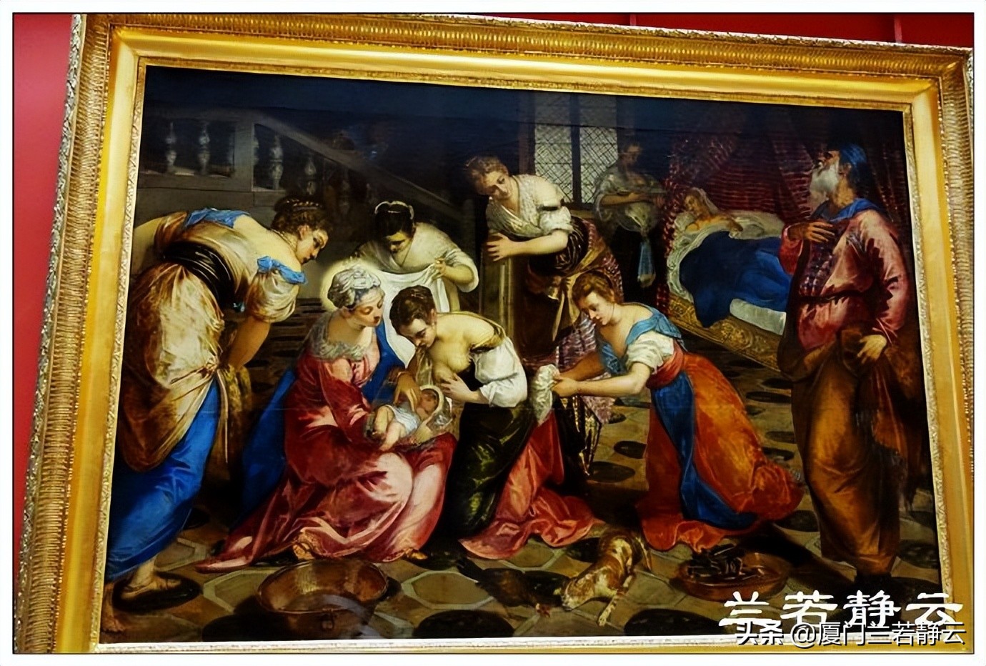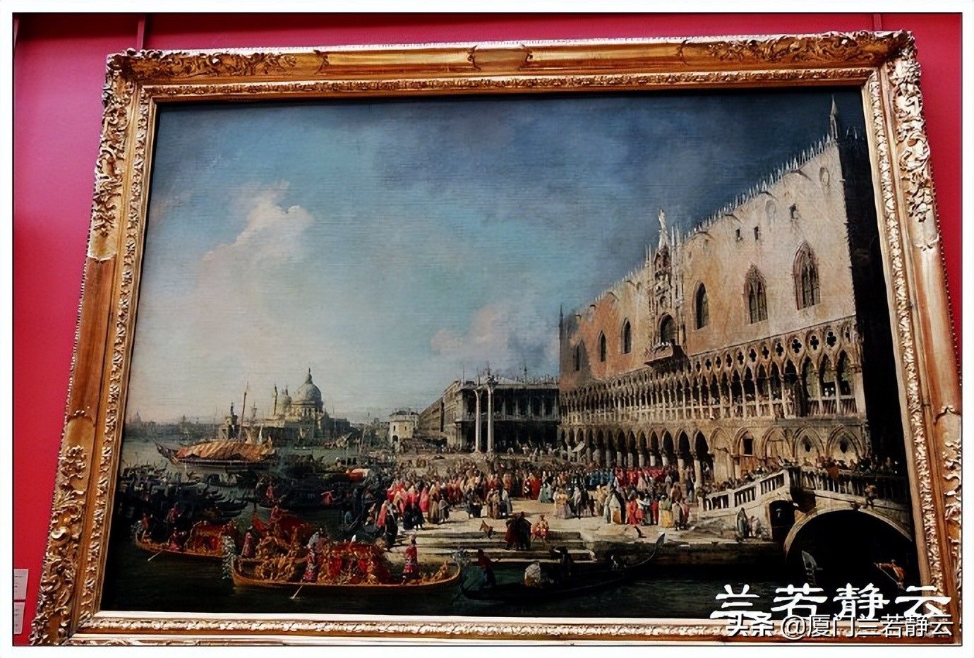 下面这幅是意大利画家卡纳列托的《威尼斯迎接法国大使》,画中使用了特殊技法,观赏者站在不同角度看,建筑物之间的距离会神奇地改变。