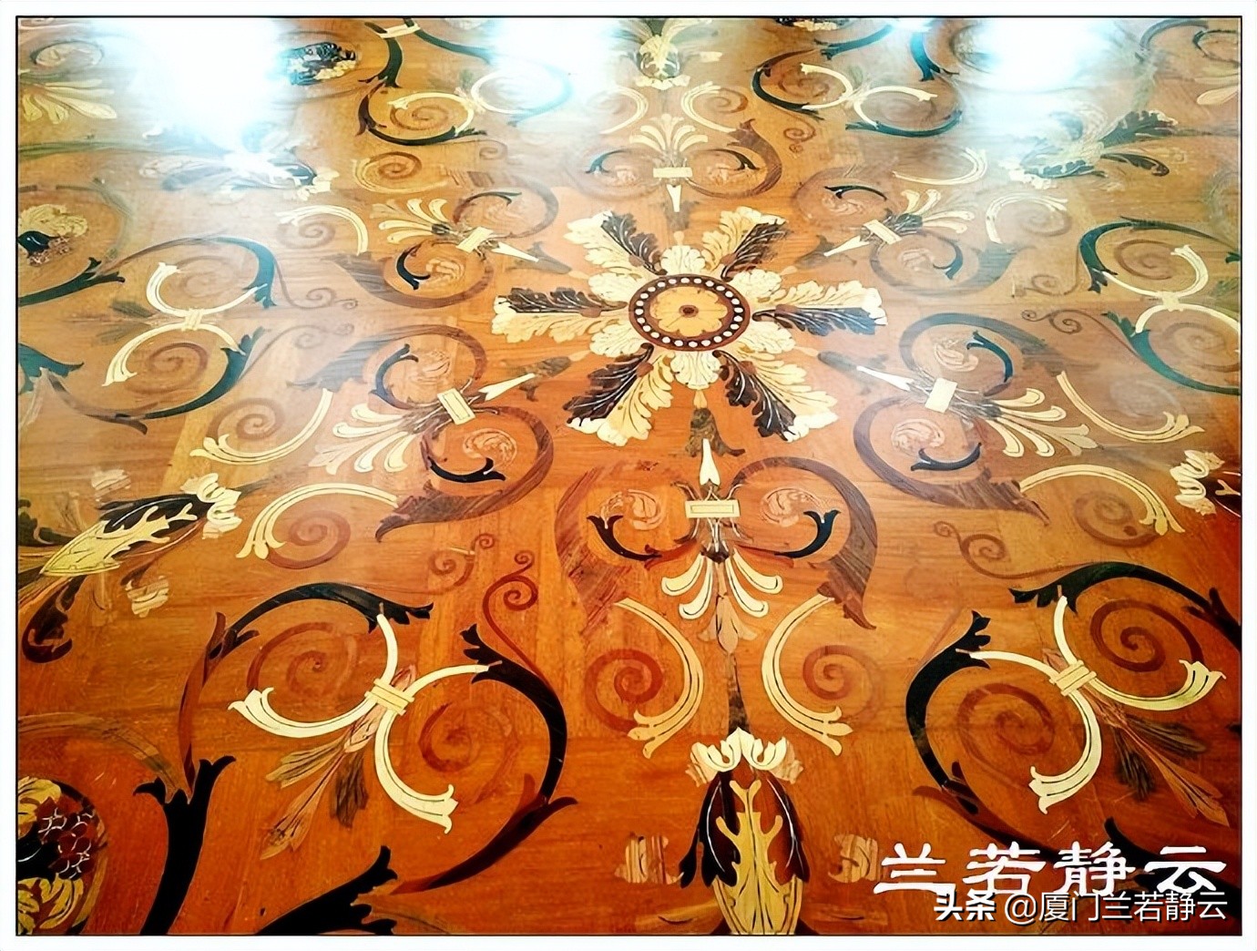 孔雀大厅地上有精美细腻的木质马赛克拼图