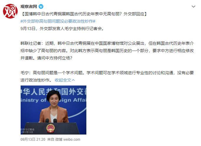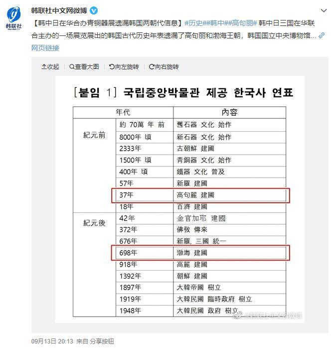 9月13日晚,韩联社发布了一条消息,直指中国国家博物馆举办的“东方吉金——中韩日古代青铜器展”,“故意”修改了他们提交的韩国古代历史年表,删去了高句丽和渤海王朝这两个“属于”韩国古代历史的王朝。在他们看来,这一行为严重伤害了韩国人民的“民族认同”,属于“歪曲”历史的行为,中方需要为这一行为道歉。