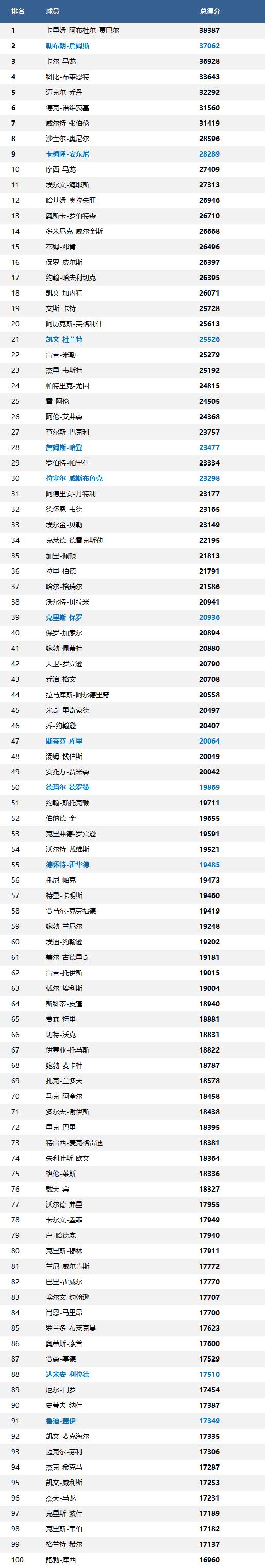 最新NBA历史得分榜排名前100名 现役12名球员上榜 詹姆斯冲击40000+