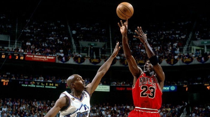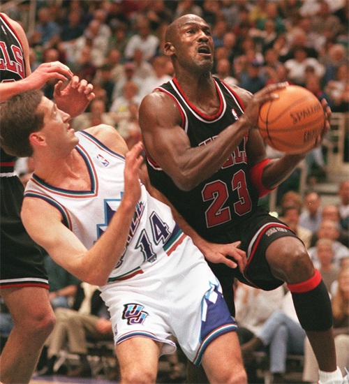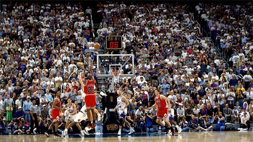 来到第六场的决胜时刻,乔丹预判到斯托克顿的包夹防守,他选择把球传给史蒂夫·科尔,而科尔也不负众望,完成了那记经典跳投终结了爵士的冠军美梦!