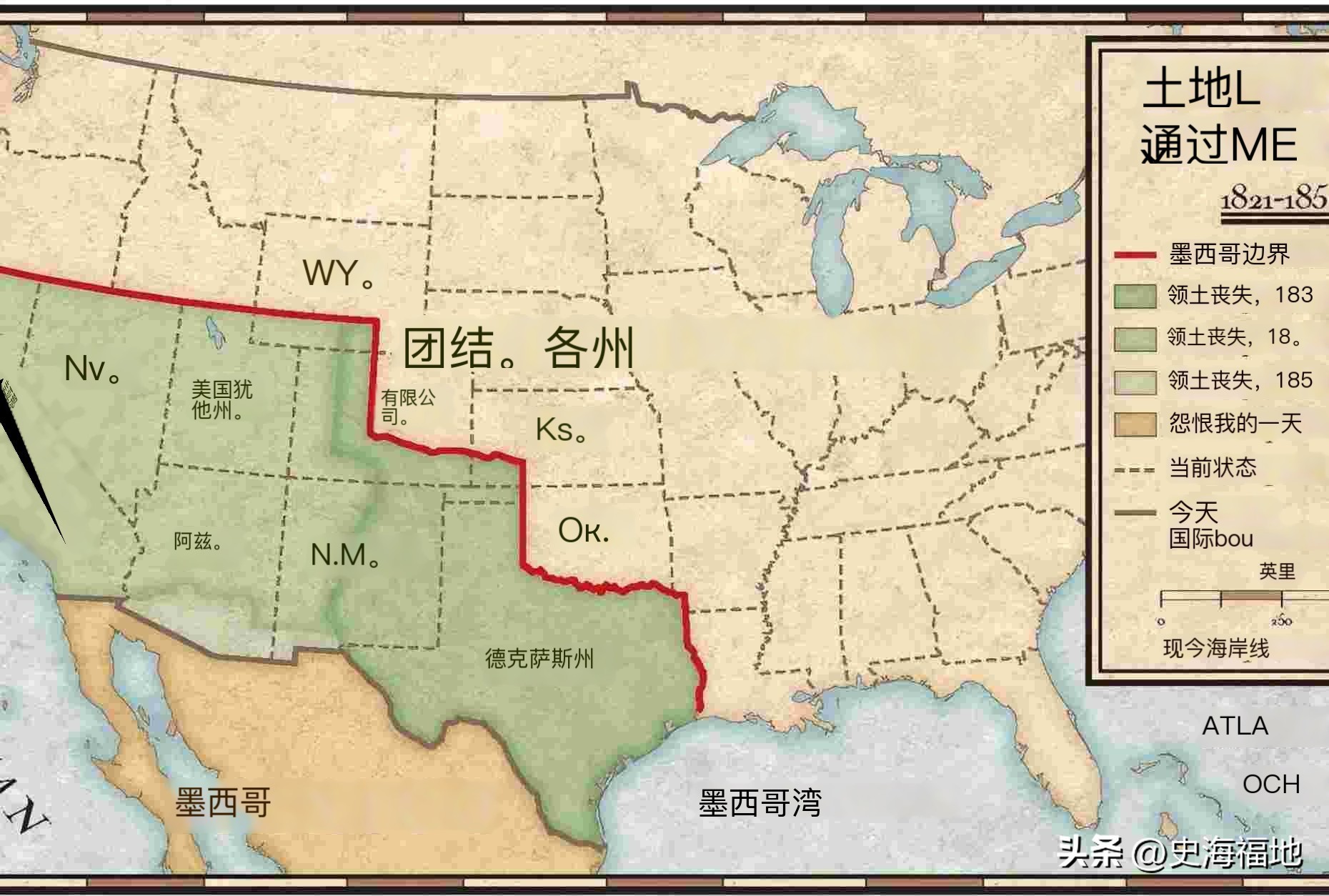 地图上的红线显示了 1821 年墨西哥脱离西班牙独立时其边界向北和向东延伸的距离。1836 年至 1853 年间,墨西哥失去了现在构成美国十个州全部或部分领土的土地(绿色区域)