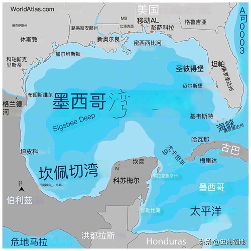 墨西哥湾是一个巨大的椭圆形海盆,位于北美洲东南海岸,北部、东北部和西北部与美国密西西比州、路易斯安那州、德克萨斯州、亚拉巴马州和佛罗里达州接壤;南部和西南部与墨西哥坎佩切州、金塔纳罗奥州、塔巴斯科州、塔毛利帕斯州、韦拉克鲁斯州和尤卡坦州接壤;东南部与古巴岛接壤。墨西哥湾通过尤卡坦海峡(位于古巴和墨西哥之间)与加勒比海相连;通过佛罗里达海峡(位于古巴和美国之间)与大西洋相连。