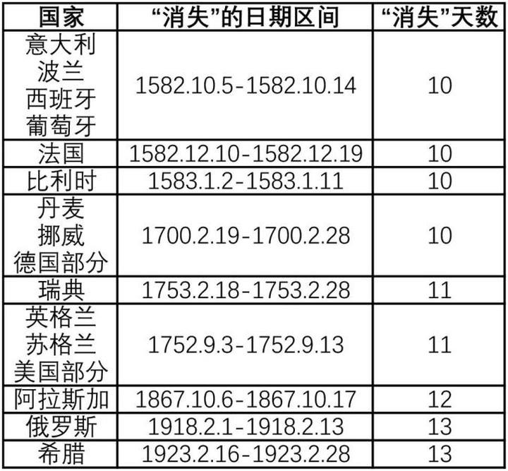 而后小编还发现,历史上有许多国家都进行过历法改革,但由于不同国家进行历法改革的时间不同,“消失”的日期区间以及天数都不尽相同。