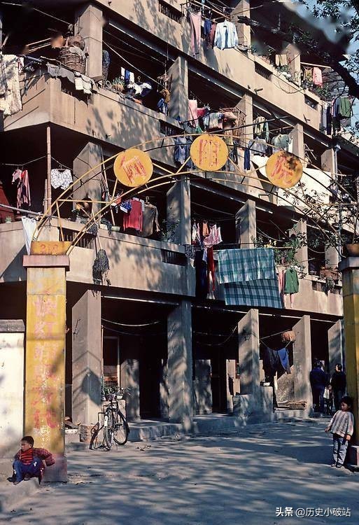 1979年的南京,在一处工人宿舍区大门口的门楼上,挂着向阳院的铁皮牌门,柱旁各有两个儿童玩耍着,家家户户的阳台上挂满了晾晒的衣物,这一幕展现了那个时代中国城市的生活状态和人文气息,让人感受到那份朴素和真实的生活态度。