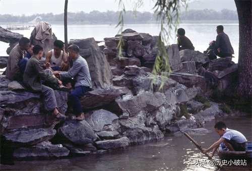 1973年的北京颐和园里,周末的休息日工人们游园的途中打着扑克牌,孩子则在一旁玩水,这一幕展现了那个时代人们的生活方式和休闲娱乐方式。