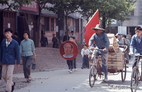 1971年的上海,5月的街头热闹非凡。一个老汉骑着黄包车,上面放着货物,街旁一个小学生举着很大的像章他的同伴则扛着红旗这可能是一个小学的宣传活动这个场景让人感受到那个时代的社会氛围和孩子们的朝气蓬勃。