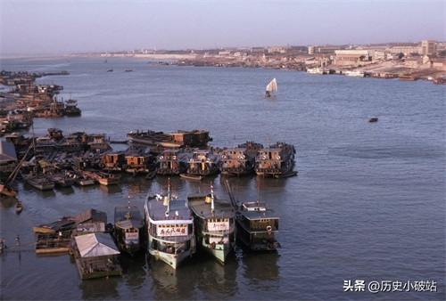1970年的长沙,湘江之上的江水幽蓝,大小船只停靠在一起。最前方的两艘像是渡船,“为人民服务”的字样清晰可见。而对岸并无多少高楼,大多是厂房。这些建筑物在夕阳的照耀下显得格外醒目。这个画面展现了那个时代长沙的独特风貌和历史背景。